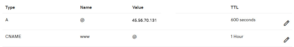6. Find the A record from the previous step, that has a name of @ and click the little pencil icon to the right. Some options will open up. In the “Value” field remove what’s there and enter 45.56.70.131 Don’t change anything else, and hit save.